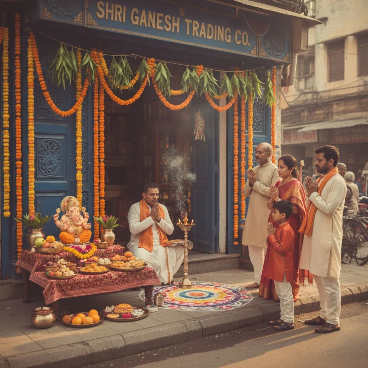The ceremony involves setting up a decorated altar with Ganapati idol or image, Kalash, flowers, fruits, sweets, and lighting diyas. A Pandit Ji guides the rituals, including Ganapati Puja, Sankalp, Kalash Puja, Havan, and Aarti. Participants include business owners, staff, and family members, all offering prayers to invite positive energy and success into the workspace.