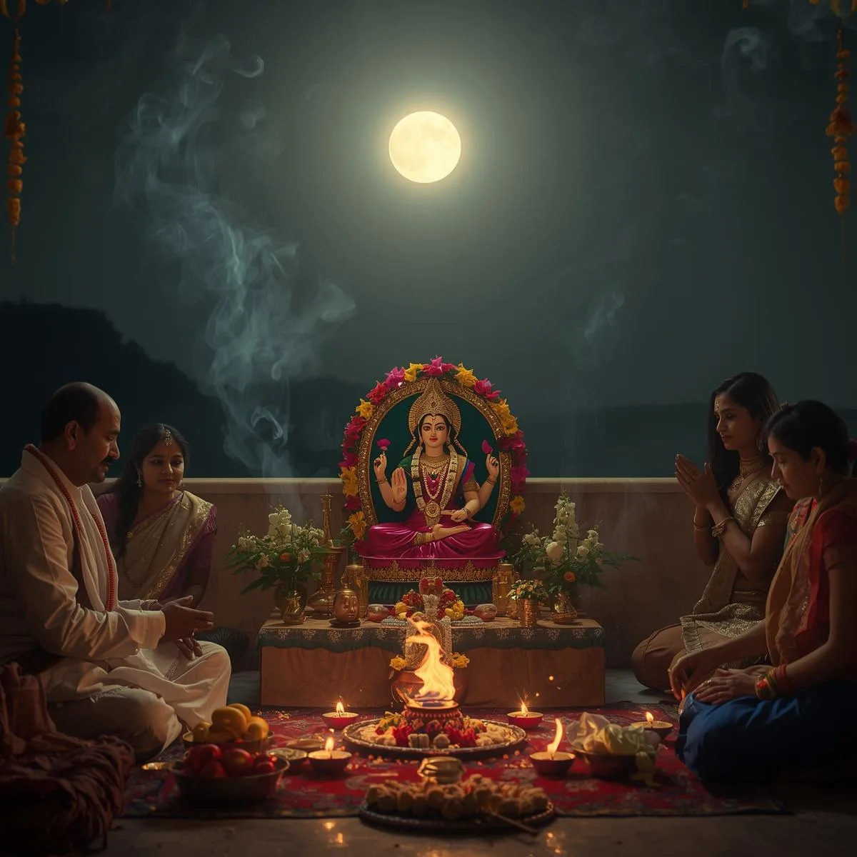 The ceremony involves setting up a beautifully decorated altar with Goddess Lakshmi idol or image, fresh flowers, fruits, sweets, and lighting diyas. A Pandit Ji performs the rituals, guiding the family in offering prayers, chanting mantras, and performing Aarti. Special offerings like kheer under the moonlight are made to seek divine grace.