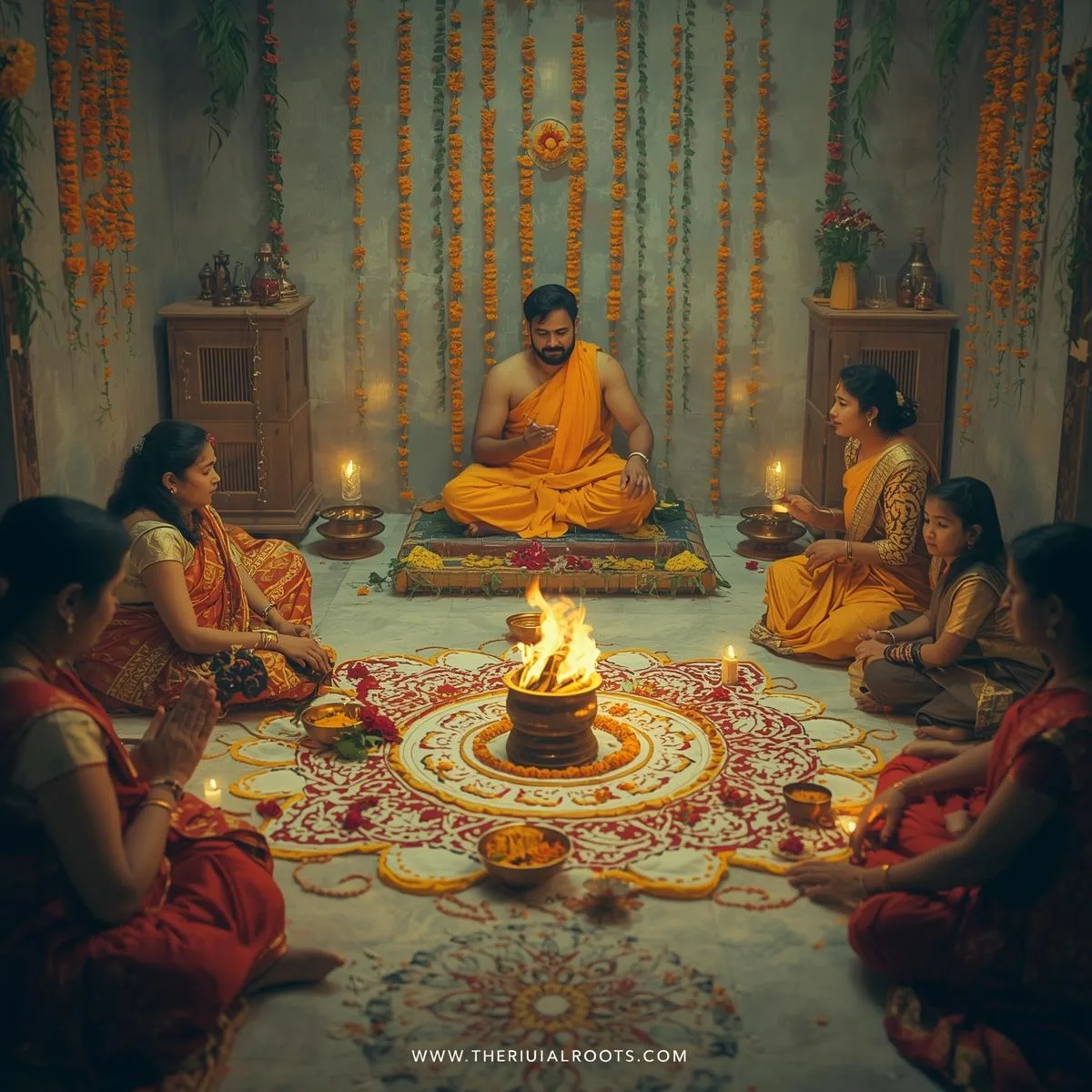 Most essential items are arranged by the priests, but flowers, fruits, turmeric, ghee, rice, and incense are usually provided by the homeowner.